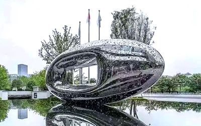 酒店不銹鋼雕塑以美為主,一般為裝飾性美陳景觀雕塑,常見于酒店大門、大堂、園林。包括但不限于水景景觀類,如圓環、噴泉、鏤空球;裝飾美陳類,如蓮花、翅膀、鵝卵石、水滴等。